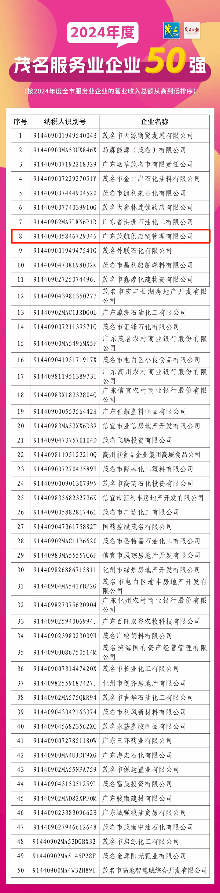根據(jù)茂名市企業(yè)聯(lián)合會于2025年7月15日發(fā)布的通報,集團下屬茂航供應鏈公司以優(yōu)異的業(yè)績表現(xiàn)位列茂名企業(yè)100強第23位,較2023年第37位躍升14名,并首次躋身茂名服務業(yè)企業(yè)50強第8位。此次雙榜單的歷史性突破,標志著茂航供應鏈公司從傳統(tǒng)供應鏈貿(mào)易商向供應鏈科技企業(yè)的轉(zhuǎn)型取得實質(zhì)性成果。
