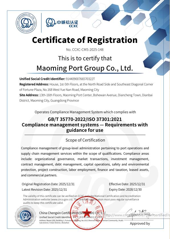 近日,茂名港集團(tuán)有限公司成功通過(guò)權(quán)威認(rèn)證機(jī)構(gòu)審核,榮獲ISO 37301:2021合規(guī)管理體系國(guó)際標(biāo)準(zhǔn)認(rèn)證與GB/T 35770-2022合規(guī)管理體系國(guó)內(nèi)標(biāo)準(zhǔn)認(rèn)證。這標(biāo)志著茂名港集團(tuán)在合規(guī)管理體系建設(shè)方面達(dá)到了國(guó)際國(guó)內(nèi)先進(jìn)水平,成為茂名市首家獲得合規(guī)管理體系認(rèn)證的市屬?lài)?guó)有企業(yè),在企業(yè)治理現(xiàn)代化與規(guī)范化道路上邁出了具有里程碑意義的關(guān)鍵一步。