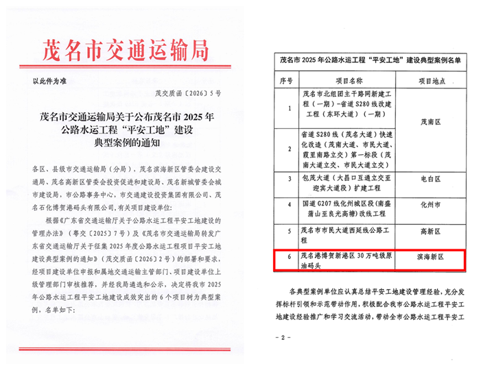 近日,茂名市交通運(yùn)輸局公布2025年全市公路水運(yùn)工程“平安工地”建設(shè)典型項目表彰名單,茂名港博賀新港區(qū)30萬噸級原油碼頭項目(以下簡稱“項目”)榮列其中。自2023年以來,項目已連續(xù)三年榮獲此項稱號,以三年如一日的深耕與篤行,筑牢水運(yùn)工程安全防線,以標(biāo)桿之姿詮釋“平安筑港”的責(zé)任擔(dān)當(dāng),成為茂名市公路水運(yùn)工程安全管理領(lǐng)域的示范樣板。
